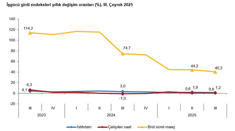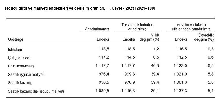 Sanayi, inşaat ve ticaret-hizmet sektörleri toplamında brüt ücret-maaş endeksi, 2025 yılı III. çeyreğinde bir önceki yılın aynı çeyreğine göre yüzde 40,3 arttı. Alt sektörler incelendiğinde, endeks; sanayi sektöründe yüzde 34,5, inşaat sektöründe yüzde 44,4 ve ticaret-hizmet sektörlerinde yüzde 43,5 arttı.