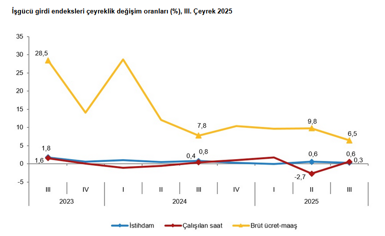 Sanayi, inşaat ve ticaret-hizmet sektörleri toplamında brüt ücret-maaş endeksi, 2025 yılı III. çeyreğinde bir önceki çeyreğe göre yüzde 6,5 arttı. Alt sektörler incelendiğinde, endeks; sanayi sektöründe yüzde 4,8, inşaat sektöründe yüzde 7,7 ve ticaret-hizmet sektörlerinde yüzde 7,3 arttı.