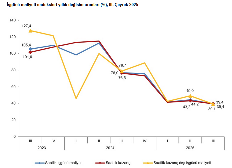 Sanayi, inşaat ve ticaret-hizmet sektörleri toplamında saatlik kazanç dışı işgücü maliyeti endeksi, 2025 yılı III. çeyreğinde bir önceki yılın aynı çeyreğine göre yüzde 39,1 arttı. Alt sektörler incelendiğinde, endeks; sanayi sektöründe yüzde 37,4, inşaat sektöründe yüzde 40,8 ve ticaret-hizmet sektörlerinde yüzde 41,5 arttı.