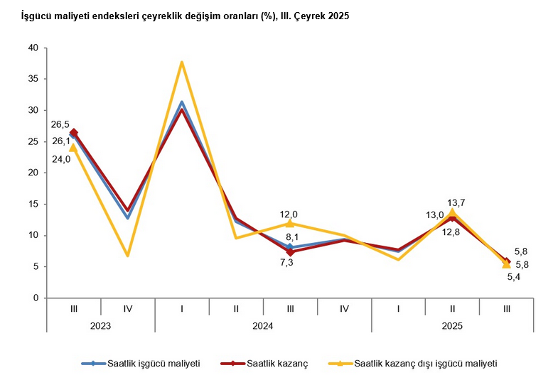 Sanayi, inşaat ve ticaret-hizmet sektörleri toplamında saatlik işgücü maliyeti endeksi, 2025 yılı III. çeyreğinde bir önceki çeyreğe göre yüzde 5,8 arttı. Alt sektörler incelendiğinde, endeks; sanayi sektöründe yüzde 5,6, inşaat sektöründe yüzde 3,5 ve ticaret-hizmet sektörlerinde yüzde 6,6 arttı.