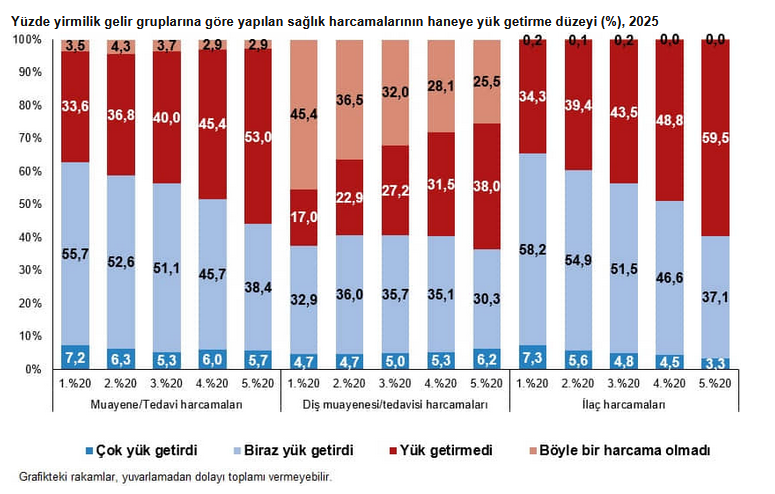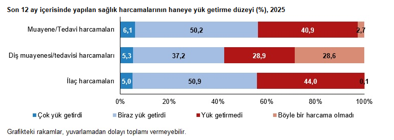 Türkiye İstatistik Kurumu’nun (TÜİK) verilerine göre, hanelerin yüzde 6,1'ine doktor muayene ve tedavi harcamalarının çok yük getirdiği, yüzde 50,2'sine biraz yük getirdiği, yüzde 40,9'una ise yük getirmediği görüldü. Diş muayene ve tedavi harcamaları hanelerin yüzde 5,3'üne çok, yüzde 37,2'sine biraz yük getirirken yüzde 28,9'una yük getirmedi. İlaç harcamaları ise hanelerin yüzde 5,0'ına çok, yüzde 50,9'una biraz yük getirdi. Hanelerin yüzde 44,0'ı ilaç harcamalarının yük getirmediğini belirtti.