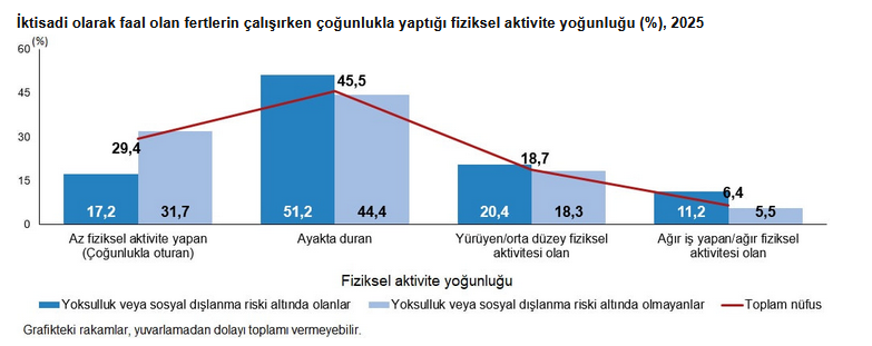 Yoksulluk veya sosyal dışlanma riski altında olan fertlerin yüzde 17,2'si oturarak çalışırken risk altında olmayan fertler için bu oran yüzde 31,7 oldu. Yoksulluk veya sosyal dışlanma riski altında olan fertlerin yüzde 11,2'sinin ağır iş ya da aktivite yaparak çalışma hayatını geçirdiği görüldü.