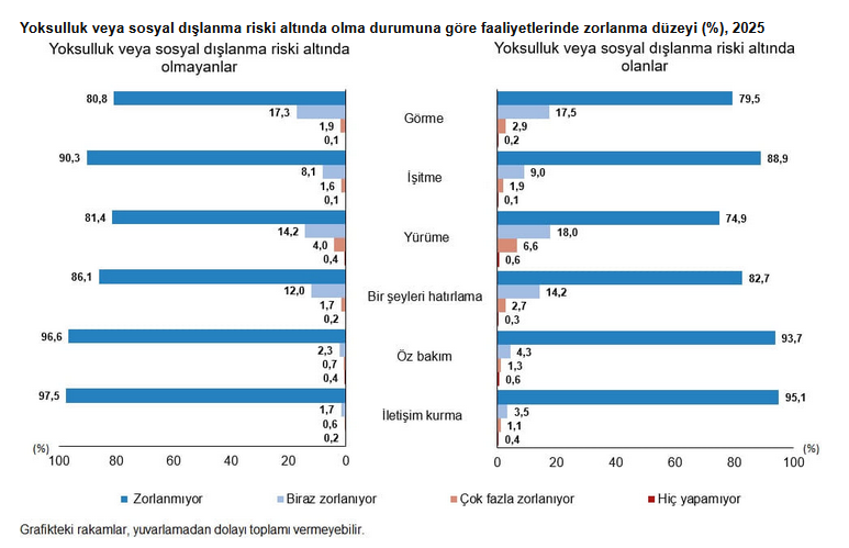 Araştırma kapsamındaki 15 yaş ve üstü fertlerin yüzde 96,9'u iletişim kurmada, yüzde 95,8'i öz bakımında, yüzde 90,0'ı işitmede, yüzde 85,2'si bir şeyleri hatırlamada, yüzde 80,5'i görmede ve yüzde 79,7'si yürümede sorun yaşamadığını ifade etti. En çok zorlanılan faaliyetler ise sırası ile yüzde 17,3 ile görme, yüzde 15,2 ile yürüme, yüzde 12,6 ile hatırlama olurken fertlerin sadece yüzde 2,2'si iletişim faaliyetlerinde zorlandığını söyledi.
