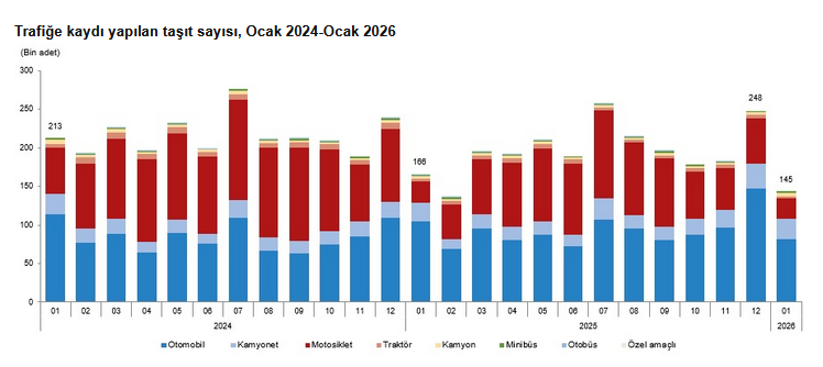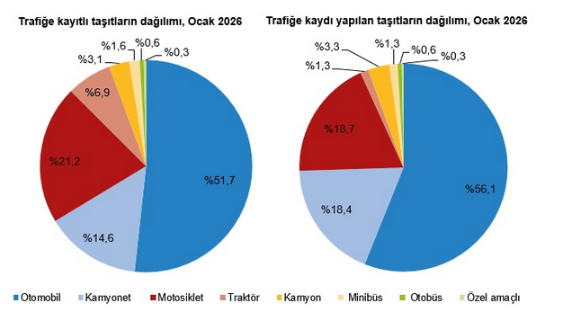 Türkiye İstatistik Kurumu’nun (TÜİK) verilerine göre, Ocak'ta trafiğe kaydı yapılan taşıtların yüzde 56,1'ini otomobil, yüzde 18,7'sini motosiklet, yüzde 18,4'ünü kamyonet, yüzde 3,3'ünü kamyon, yüzde 1,3'ünü minibüs, yüzde 1,3'ünü traktör, yüzde 0,6'sını otobüs ve yüzde 0,3'ünü özel amaçlı taşıtlar oluşturdu.