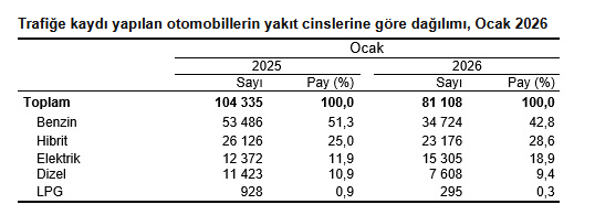 Ocak'ta trafiğe kaydı yapılan 81 bin 108 adet otomobilin yüzde 42,8'i benzin, yüzde 28,6'sı hibrit, yüzde 18,9'u elektrikli, yüzde 9,4'ü dizel ve yüzde 0,3'ü LPG yakıtlıdır. Ocak ayı sonu itibarıyla trafiğe kayıtlı 17 milyon 457 bin 542 adet otomobilin ise yüzde 32,5'i dizel, yüzde 31,0'ı benzin, yüzde 30,0'ı LPG, yüzde 4,1'i hibrit ve yüzde 2,2'si elektriklidir. Yakıt türü bilinmeyen otomobillerin oranı ise yüzde 0,2'dir.