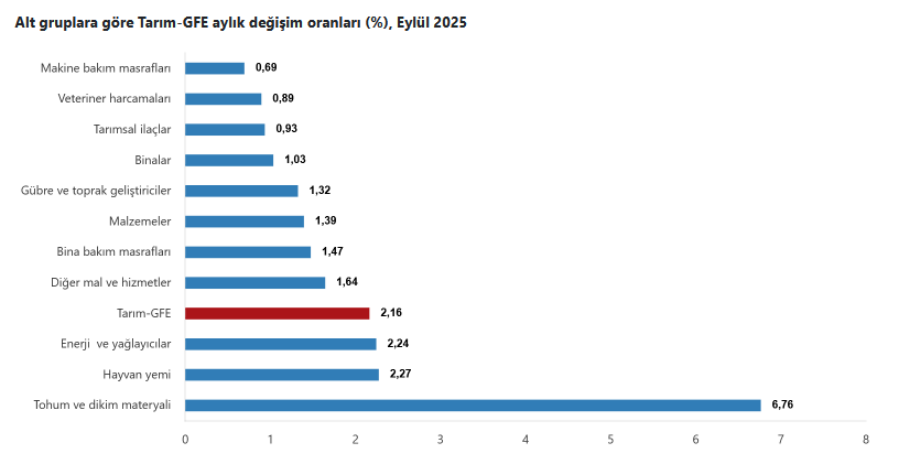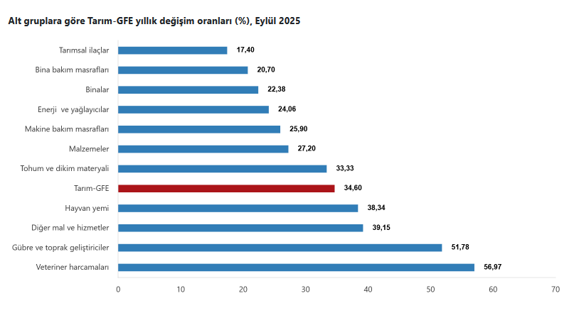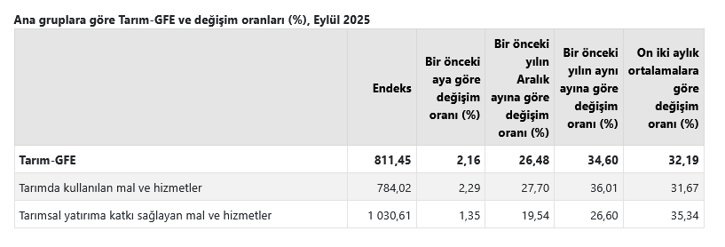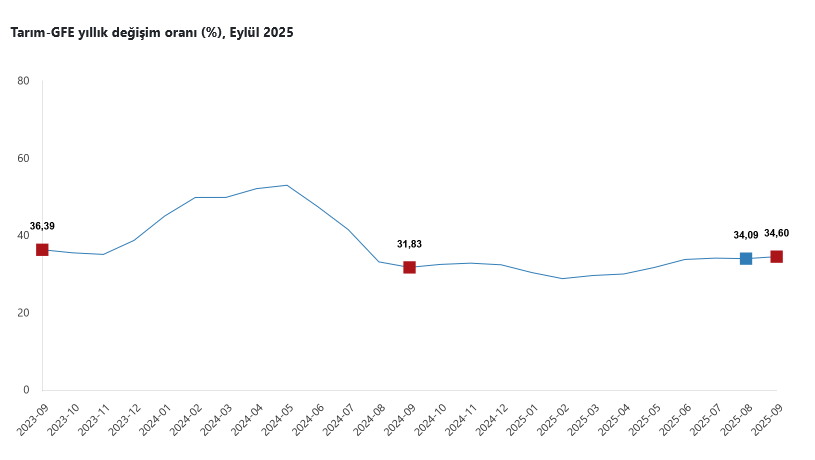 Türkiye İstatistik Kurumu (TÜİK) verilerine göre, Tarım-GFE'de (2020=100), Eylül'de aylık bazda yüzde 2,16 artış, bir önceki yılın Aralık ayına göre yüzde 26,48 artış, yıllık bazdayüzde 34,60 artış ve on iki aylık ortalamalara göre yüzde 32,19 artış gerçekleşti.