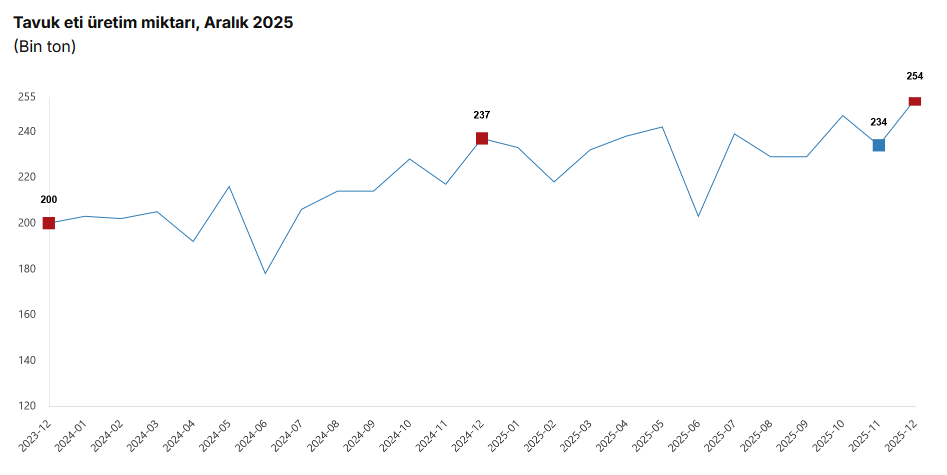 Bir önceki ay 233 bin 887 ton olan tavuk eti üretimi Aralık ayında yüzde 8,6 oranında artarak 253 bin 993 ton oldu.
