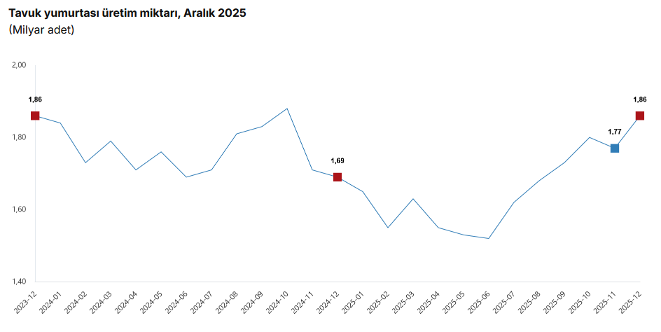Bir önceki ay 1 milyar 767 milyon 68 bin adet olan tavuk yumurtası üretimi Aralık ayında yüzde 5,3 oranında artarak 1 milyar 860 milyon 594 bin adet oldu.