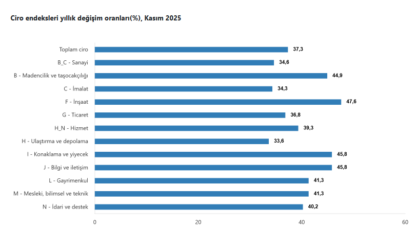 Toplam cironun alt detaylarına bakıldığında; 2025 yılı Kasım ayında yıllık sanayi sektörü ciro endeksi yüzde 34,6 arttı, inşaat ciro endeksi yüzde 47,6 arttı, ticaret ciro endeksi yüzde 36,8 arttı, hizmet ciro endeksi yüzde 39,3 arttı.