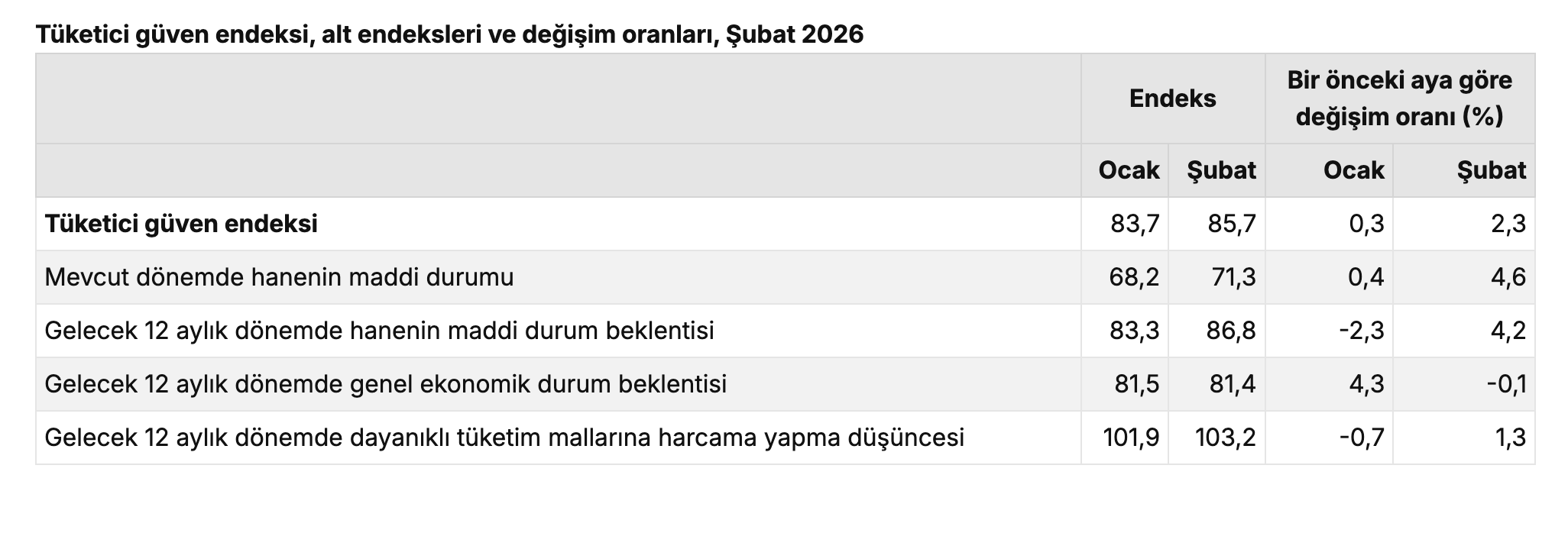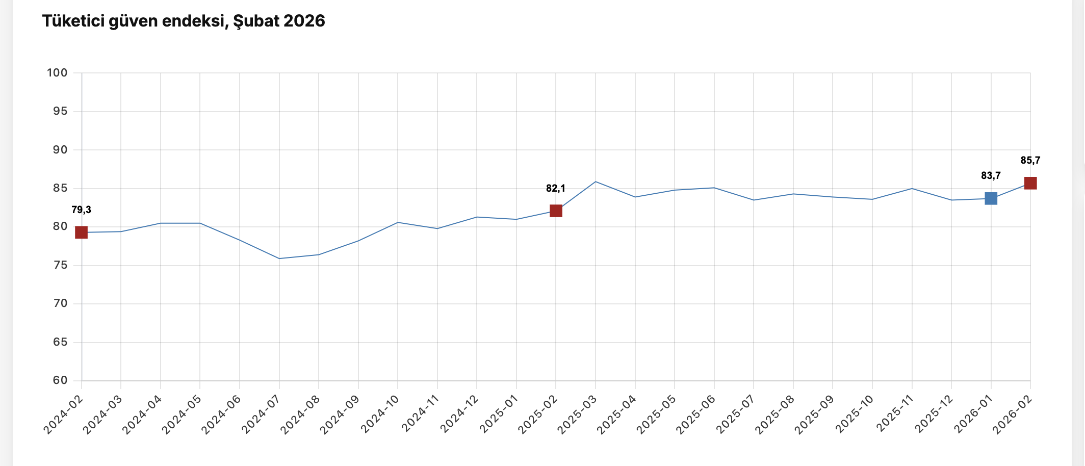 Türkiye İstatistik Kurumu’nun (TÜİK) verilerine göre, tüketici güven endeksi Ocak ayında 83,7 iken Şubat ayında yüzde 2,3 oranında artarak 85,7 olarak gerçekleşti.