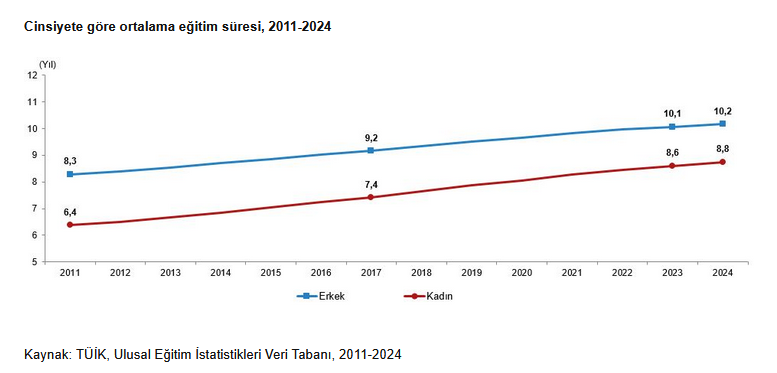 Ulusal Eğitim İstatistiklerine göre 25 yaş ve üzeri nüfusun ortalama eğitim süresinin yıllara göre arttığı görüldü. Türkiye geneli için 25 yaş ve üzeri nüfusun ortalama eğitim süresi 2011 yılında 7,3 yıl, kadınlarda 6,4 yıl, erkeklerde 8,3 yıl iken, 2024 yılında Türkiye genelinde 9,5 yıl, kadınlarda 8,8 yıl, erkeklerde 10,2 yıl oldu.