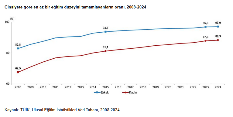 Ulusal Eğitim İstatistiklerine göre en az bir eğitim düzeyini tamamlayan 25 ve daha yukarı yaştaki nüfusun toplam nüfus içindeki oranının 2008-2024 yılları arasında arttığı görüldü. En az bir eğitim düzeyini tamamlayan 25 ve daha yukarı yaştaki bireylerin toplam nüfus içindeki oranı, 2008 yılında yüzde 75,1 iken 2024 yılında yüzde 92,6 oldu. Bu oran cinsiyete göre incelendiğinde, 2008 yılında en az bir eğitim düzeyini tamamlayan 25 ve daha yukarı yaştaki kadınların oranı yüzde 67,5, erkeklerin oranı yüzde 82,8 iken, bu oran 2024 yılında kadınlarda yüzde 88,3, erkeklerde ise yüzde 97,0 oldu.