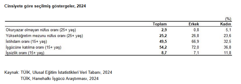Ulusal Eğitim İstatistiklerine göre yüksekokul ve fakülte, yüksek lisans ve doktora mezunu olan 25 ve daha yukarı yaştaki nüfusun toplam nüfus içindeki oranı, 2008 yılında yüzde 9,1 iken 2024 yılında yüzde 25,2 oldu. Bu oran cinsiyete göre incelendiğinde, 2008 yılında yükseköğretim mezunu olan 25 ve daha yukarı yaştaki kadınların oranı yüzde 7,1, erkeklerin oranı yüzde 11,2 iken bu oran 2024 yılında kadınlarda yüzde 23,6, erkeklerde ise yüzde 26,8 oldu.