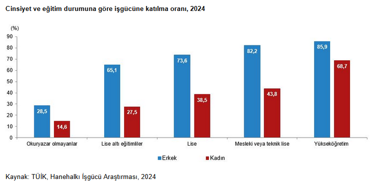 İşgücüne katılma oranı eğitim durumuna göre incelendiğinde, kadınların eğitim seviyesi yükseldikçe işgücüne daha fazla katıldıkları görüldü. Okuryazar olmayan kadınların işgücüne katılma oranı yüzde 14,6, lise altı eğitimli kadınların işgücüne katılma oranı yüzde 27,5, lise mezunu kadınların işgücüne katılma oranı yüzde 38,5, mesleki veya teknik lise mezunu kadınların işgücüne katılma oranı yüzde 43,8 iken, yükseköğretim mezunu kadınların işgücüne katılma oranı yüzde 68,7 oldu.