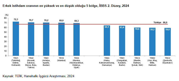 En yüksek erkek istihdam oranı, yüzde 72,3 ile TR21 (Tekirdağ, Edirne, Kırklareli) bölgesinde, en düşük erkek istihdam oranı ise yüzde 59,0 ile TRC2 (Şanlıurfa, Diyarbakır) bölgesinde gerçekleşti.