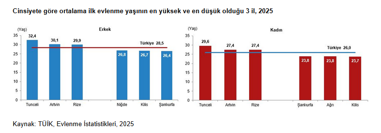 Evlenme İstatistiklerine göre resmi olarak ilk evliliğini 2025 yılında yapmış olan kadınların ortalama evlenme yaşı 26,0 iken erkeklerin ortalama evlenme yaşı 28,5 oldu. Ortalama ilk evlenme yaşının en yüksek olduğu il, kadınlarda 29,6 yaş, erkeklerde 32,4 yaş ile Tunceli oldu. Ortalama ilk evlenme yaşının en düşük olduğu il ise kadınlarda 23,7 yaş ile Kilis, erkeklerde 26,4 yaş ile Şanlıurfa oldu.