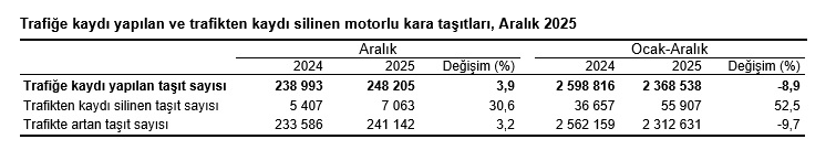 Türkiye İstatistik Kurumu (TÜİK) verilerine göre, Türkiye'de 2025 yılında bir önceki yıla göre trafiğe kaydı yapılan taşıt sayısı yüzde 8,9 azalarak 2 milyon 368 bin 538 adet olurken, trafikten kaydı silinen taşıt sayısı yüzde 52,5 artarak 55 bin 907 adet oldu. Böylece Ocak-Aralık döneminde trafikteki toplam taşıt sayısında 2 milyon 312 bin 631 adet artış gerçekleşti.