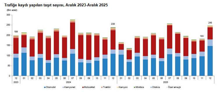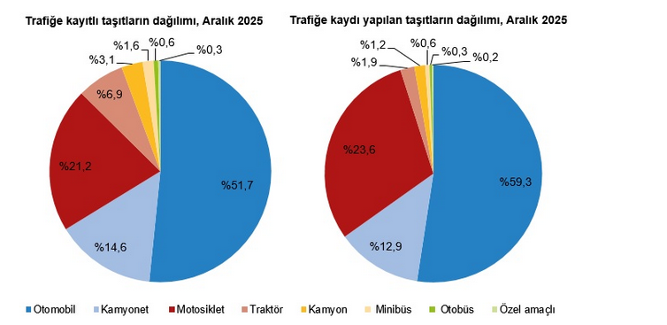 Aralık ayında trafiğe kaydı yapılan taşıtların %59,3'ünü otomobil, yüzde 23,6'sını motosiklet, yüzde 12,9'unu kamyonet, yüzde 1,9'unu traktör, yüzde 1,2'sini kamyon, yüzde 0,6'sını minibüs, yüzde 0,3'ünü otobüs ve yüzde 0,2'sini özel amaçlı taşıtlar oluşturdu.