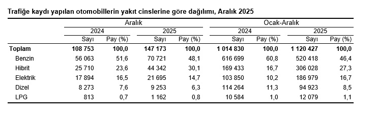 Ocak-Aralık döneminde trafiğe kaydı yapılan 1 milyon 120 bin 427 adet otomobilin yüzde 46,4'ü benzinli, yüzde 27,3'ü hibrit, yüzde 16,7'si elektrikli, yüzde 8,5'i dizel ve yüzde 1,1'i LPG'lidir. Aralık ayı sonu itibarıyla trafiğe kayıtlı 17 milyon 373 bin 581 adet otomobilin ise yüzde 32,6'sı dizel, yüzde 30,9'u benzinli, yüzde 30,1'i LPG'li, yüzde 4,0'ı hibrit ve yüzde 2,1'i elektriklidir. Yakıt türü bilinmeyen(3) otomobillerin payı ise yüzde 0,2'dir.