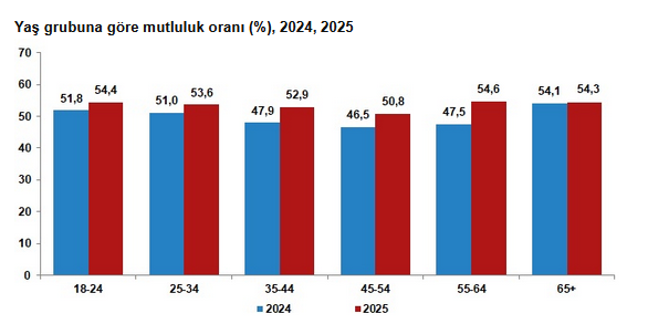 Mutluluk oranı tüm yaş gruplarında arttı. Mutluluk oranı 2025 yılında bir önceki yıla göre 18-24 yaş grubunda 2,6 puan artış ile yüzde 54,4, 25-34 yaş grubunda 2,6 artış ile yüzde 53,6, 35-44 yaş grubunda 5,0 puan artış ile yüzde 52,9, 45-54 yaş grubunda 4,3 puan artış ile yüzde 50,8 olarak gerçekleşti. 65 ve daha yukarı yaştaki bireylerde ise 2024 yılında yüzde 54,1 iken 2025 yılında 0,2 puan artarak yüzde 54,3 oldu.