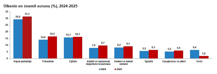 Ülkenin en önemli sorunu incelendiğinde; 2025 yılında hayat pahalılığı yüzde 31,3 ile ilk sırada yer alırken yüzde 16,5 ile yoksulluk ikinci sırada ve yüzde 16,1 ile eğitim üçüncü sırada yer aldı.