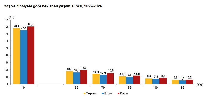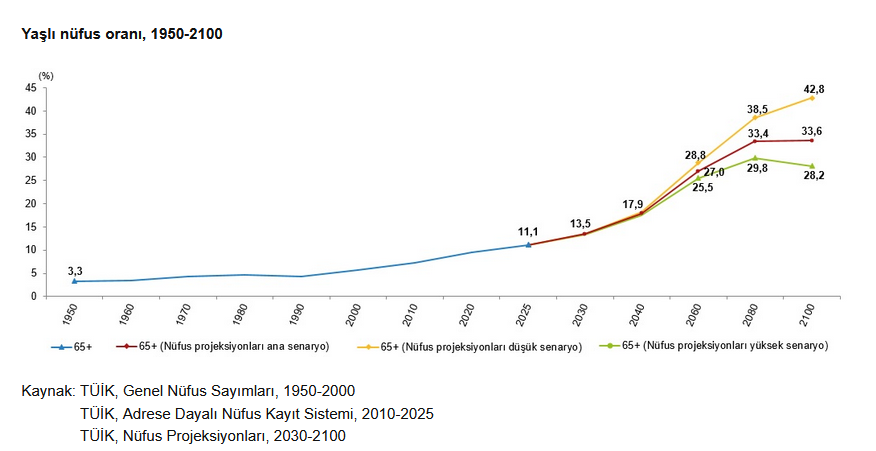 TÜİK’in nüfus projeksiyonlarına göre mevcut demografik eğilimlerin sürmesi halinde yaşlı nüfus oranının 2030’da yüzde 13,5’e, 2040’ta yüzde 17,9’a, 2060’ta yüzde 27’ye ve 2080’de yüzde 33,4’e yükselmesi bekleniyor. Doğurganlık oranının daha hızlı düşmesi durumunda bu oranın 2100 yılında yüzde 42,8’e kadar çıkabileceği, doğurganlığı artırıcı politikaların etkili olması halinde ise yüzde 28,2 seviyesinde gerçekleşebileceği öngörülüyor.