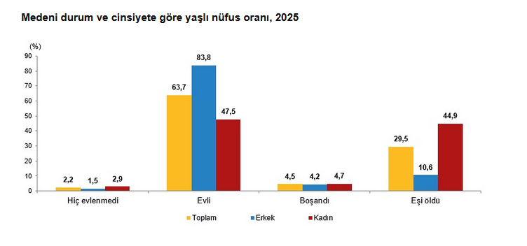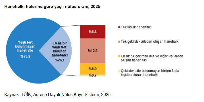 TÜİK verilerine göre Türkiye’de yaklaşık her dört haneden birinde en az bir yaşlı birey bulunuyor. 2025 yılında 26 milyon 977 bin 795 hanenin 7 milyon 46 bin 560’ında en az bir yaşlı fert yaşarken, 1 milyon 836 bin 496 yaşlı bireyin tek başına yaşadığı belirlendi. Tek başına yaşayan yaşlıların yüzde 73,5’ini kadınlar oluşturdu.