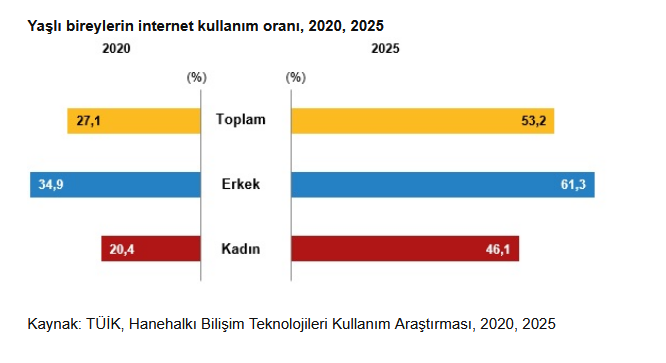 Öte yandan yaşlı bireylerin internet kullanımında da artış görüldü. 65-74 yaş grubunda internet kullananların oranı 2020 yılında yüzde 27,1 iken 2025 yılında yüzde 53,2’ye yükseldi. Erkeklerde internet kullanım oranı yüzde 61,3, kadınlarda ise yüzde 46,1 olarak ölçüldü.