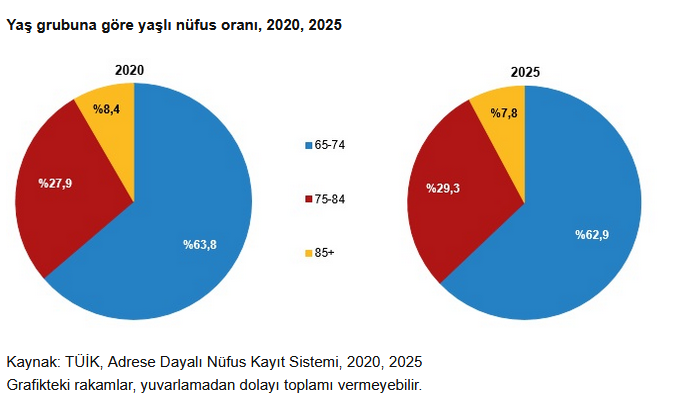 Yaşlı nüfus yaş gruplarına göre incelendiğinde, 2025 yılında 65-74 yaş grubunun yüzde 62,9 ile en büyük paya sahip olduğu görüldü. Bu grubu yüzde 29,3 ile 75-84 yaş ve yüzde 7,8 ile 85 yaş ve üzeri grup izledi. 100 yaş ve üzerindeki kişi sayısı ise 2025 yılında 8 bin 290 olarak kaydedildi.