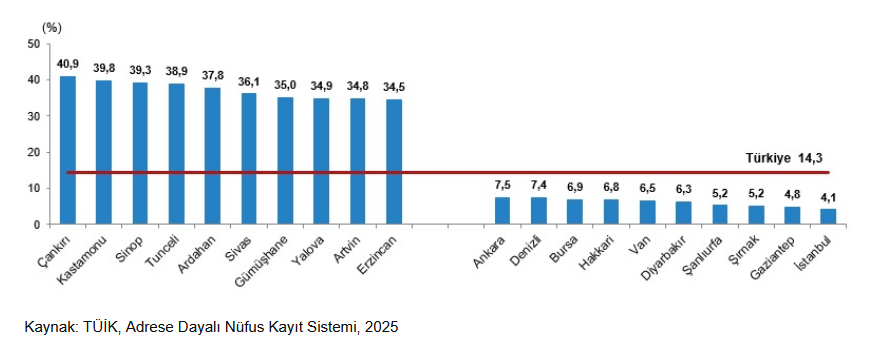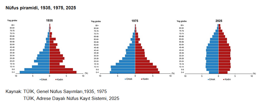 Türkiye’de nüfusun yaş yapısında da değişim yaşandığı belirtildi. Çocuk ve genç nüfusun toplam içindeki payı azalırken yaşlı nüfusun payı artış gösterdi. Ortanca yaş ise 2020 yılında 32,7 iken 2025 yılında 34,9’a yükseldi. Ortanca yaş erkeklerde 34,2, kadınlarda ise 35,7 olarak hesaplandı.