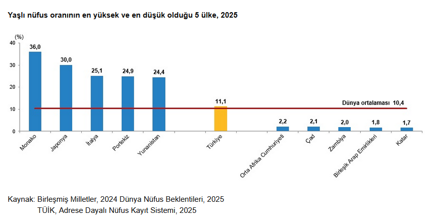 Birleşmiş Milletler verilerine göre 2025 yılında dünya nüfusunun yüzde 10,4’ünü yaşlı nüfus oluştururken Türkiye, yaşlı nüfus oranına göre 194 ülke arasında 75. sırada yer aldı.