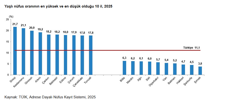 İllere göre dağılıma bakıldığında yaşlı nüfus oranının en yüksek olduğu il yüzde 21,7 ile Sinop oldu. Bu ili yüzde 21,1 ile Kastamonu ve yüzde 20 ile Giresun izledi. Yaşlı nüfus oranının en düşük olduğu il ise yüzde 3,8 ile Şırnak olarak kaydedildi.