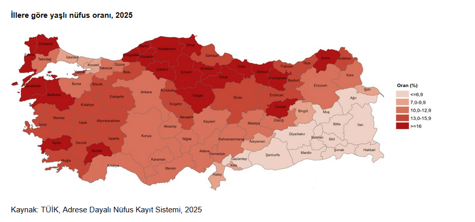 Çalışma çağındaki 100 kişiye düşen yaşlı sayısını ifade eden yaşlı bağımlılık oranı da artış gösterdi. Bu oran 2020 yılında yüzde 14,1 iken 2025 yılında yüzde 16,2’ye çıktı.