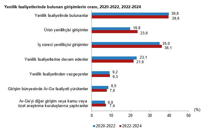Türkiye İstatistik Kurumu’nun (TÜİK) verilerine göre, araştırma sonuçlarına göre çalışan sayısı 10 ve daha fazla olan girişimlerin yüzde 39,6'sı, 2022-2024 yıllarını kapsayan üç yıllık dönemde yenilik faaliyetinde bulundu. Bir önceki referans dönemde (2020-2022) bu oran yüzde 39,8 olarak hesaplandı. Çalışan sayısı 10-49 olan girişimlerin yüzde 36,6'sı, 50-249 çalışanı olan girişimlerin yüzde 49,6'sı, 250 ve daha fazla çalışanı olan girişimlerin ise yüzde 69,3'ü piyasaya yeni ya da önemli ölçüde iyileştirilmiş bir ürün (mal ya da hizmet) sunmaya veya iş süreci yeniliği uygulamaya yönelik çalışmalarda bulundu. Sanayi sektöründe yenilik faaliyetlerinde bulunan girişimlerin oranı yüzde 42,1 iken; hizmet sektöründe bu oran yüzde 36,9 oldu.