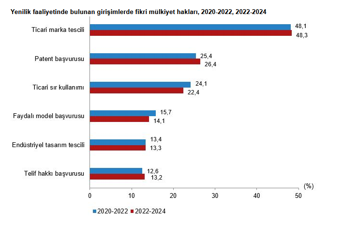 Yenilik faaliyetleri ile elde edilen rekabetçi avantajı etkin koruma yöntemlerinin de sorgulandığı araştırmada, yenilik faaliyetinde bulunan girişimlerin yüzde 48,3'ünün ticari marka tescili yaptırdığı tespit edildi. Bunu yüzde 26,4 ile patent başvurusu, yüzde 22,4 ile ticari sır kullanımı, yüzde 14,1 ile faydalı model başvurusu, yüzde 13,3 ile endüstriyel tasarım tescili ve yüzde 13,2 ile telif hakkı başvurusu izledi.