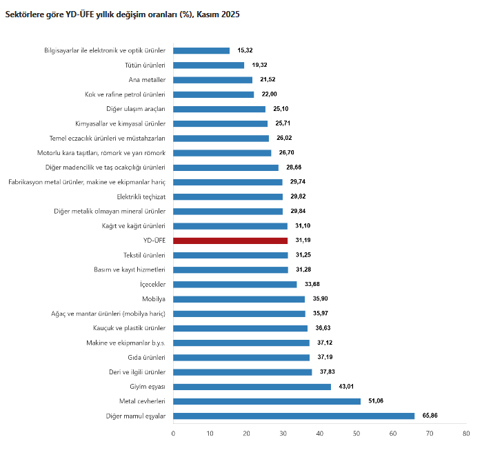 Türkiye İstatistik Kurumu (TÜİK) verilerine göre, Yurt Dışı Üretici Fiyat Endeksi (YD-ÜFE) Kasım'da aylık bazda yüzde 1,02, bir önceki yılın Aralık ayına göre yüzde 30,01, yıllık bazda yüzde 31,19 ve on iki aylık ortalamalara göre yüzde 25,67 arttı.