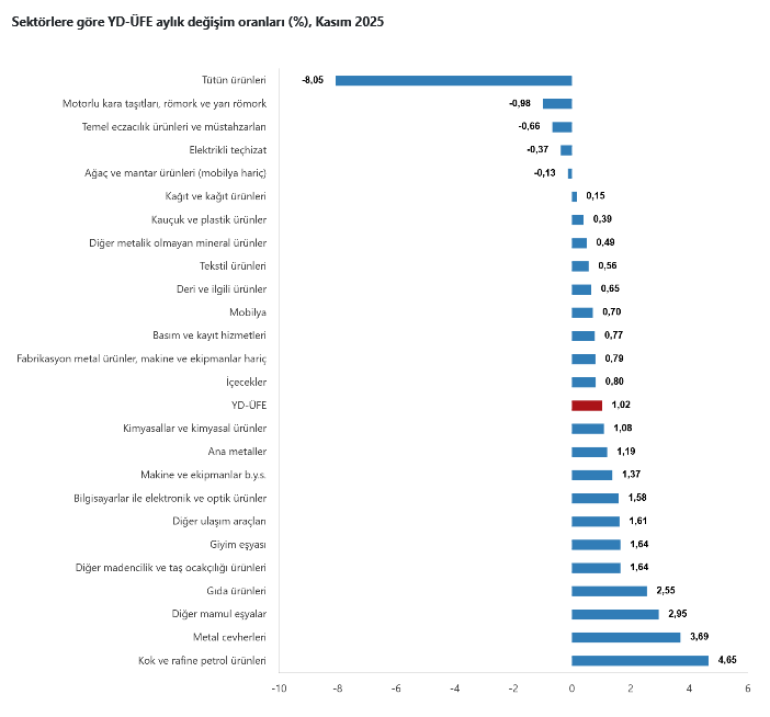 Ana sanayi gruplarının aylık değişimleri; ara mallarında yüzde 1,03, dayanıklı tüketim mallarında yüzde 0,37, dayanıksız tüketim mallarında yüzde 1,46, enerjide yüzde 4,65, sermaye mallarında yüzde 0,14 arttı.
