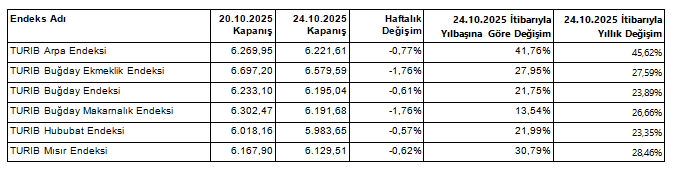 “TÜRİB Arpa Endeksi: 20.10.2025 6.269,95 seviyesinde, 24.10.2025 günü ise 6.221,61 seviyesinde kapanmıştır. Haftalık değişim -yüzde 0,77, yıllık değişim yüzde 45,62 olmuştur.
