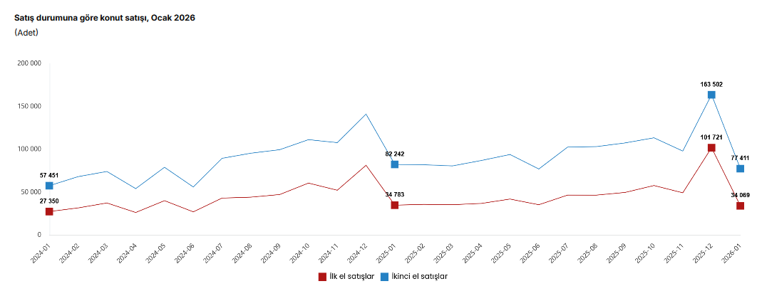 Türkiye İstatistik Kurumu (TÜİK) verilerine göre, Türkiye genelinde ilk el konut satış sayısı Ocak'ta yıllık bazda yüzde 2,1 azalarak 34 bin 69'a düştü. İkinci el konut satışları ise Ocak'ta yıllık bazda yüzde 5,9 azalarak 77 bin 411'e düştü. Toplam konut satışları içinde ilk el konut satışlarının payı yüzde 30,6, ikinci el konut satışlarının payı yüzde 69,4 oldu.