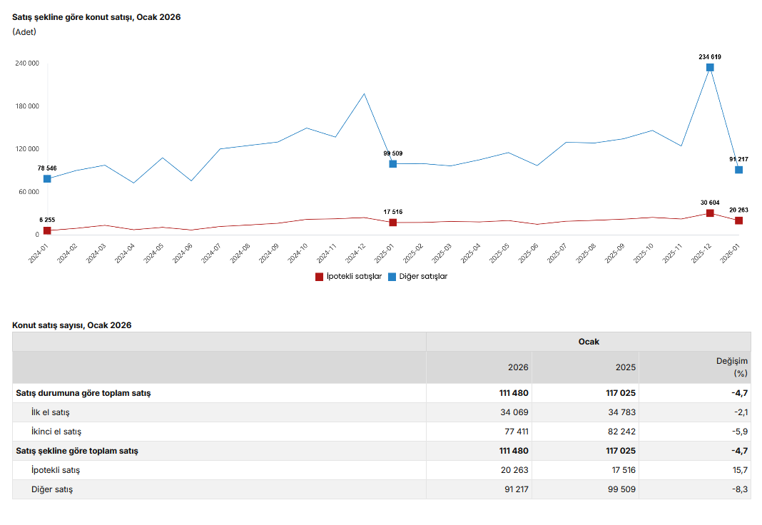 Türkiye genelinde ipotekli konut satışları Ocak'ta  yıllık bazda yüzde 15,7 artarak 20 bin 263'e yükseldi. Diğer konut satışları ise Ocak'ta yıllık bazda yüzde 8,3 azalarak 91 bin 217'ye indi. Toplam konut satışları içinde ipotekli satışların payı yüzde 18,2, diğer satışların payı yüzde 81,8 olarak gerçekleşti.