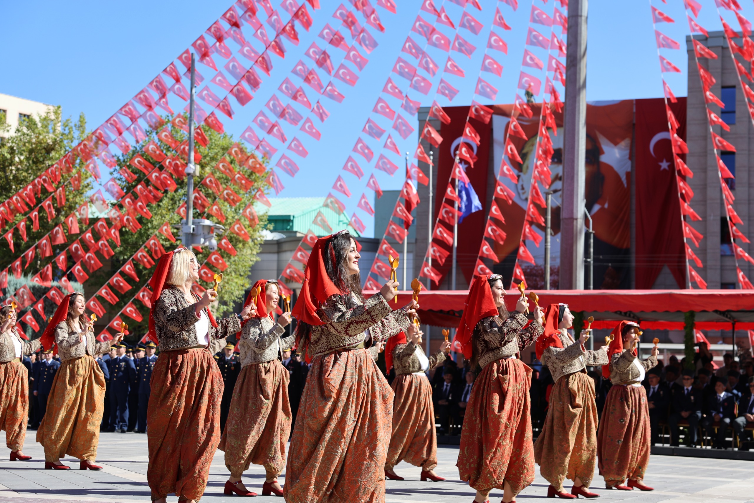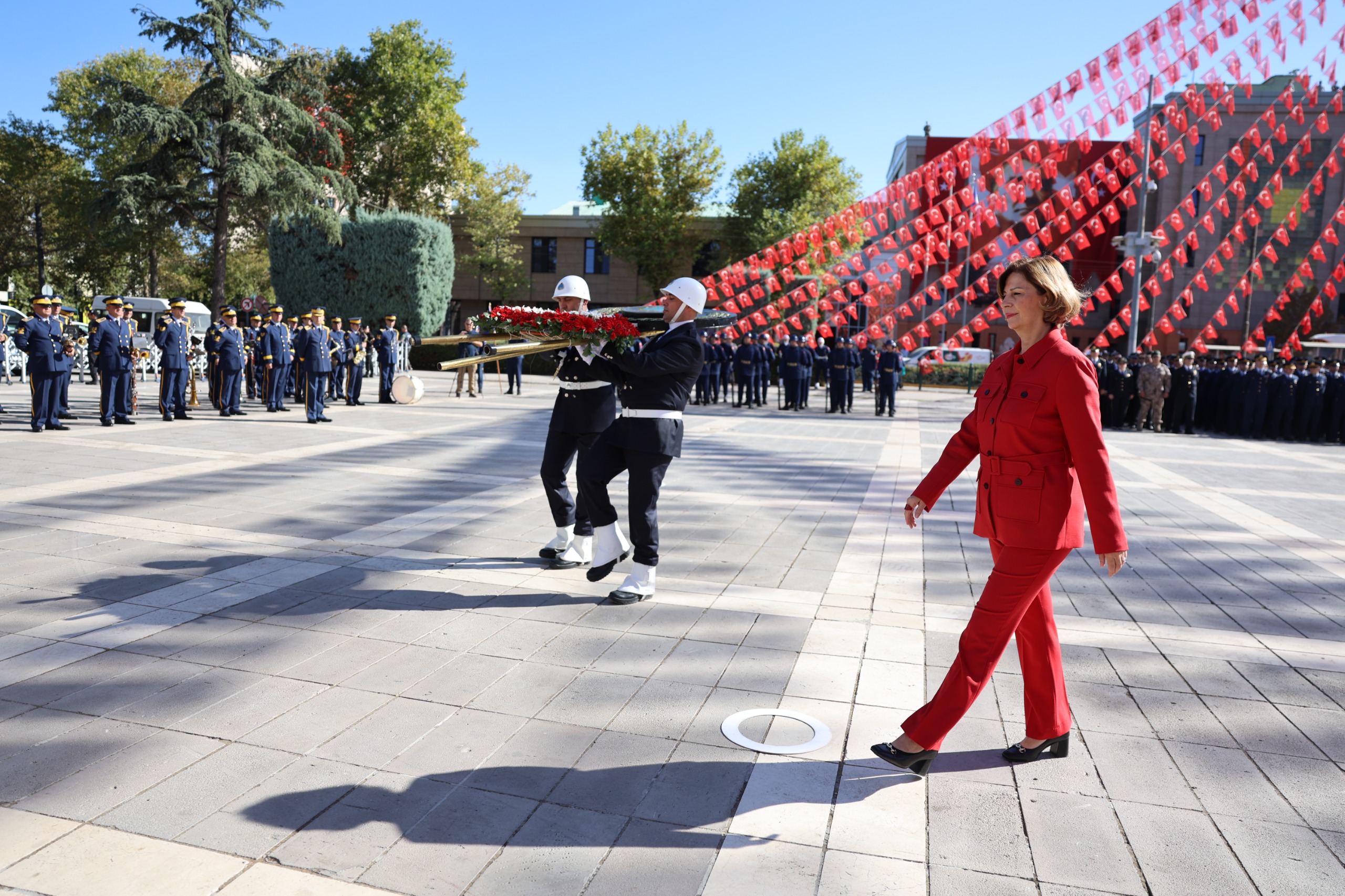 Atatürk Anıtı’na Valilik, Muharip Hava Kuvvetleri Komutanlığı ve Büyükşehir Belediye Başkanlığı tarafından çelenk sunuldu. Askeri Bando eşliğinde saygı duruşunda bulunulmasının ardından İstiklal Marşı okundu.