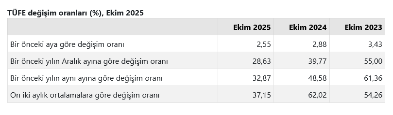(Ayrıntılarla yenilendi) Türkiye İstatistik Kurumu’nun (TÜİK) verilerine göre, TÜFE'deki (2003=100) değişim 2025 yılı Ekim ayında bir önceki aya göre yüzde 2,55 artış, bir önceki yılın Aralık ayına göre yüzde 28,63 artış, bir önceki yılın aynı ayına göre yüzde 32,87 artış ve on iki aylık ortalamalara göre yüzde 37,15 artış olarak gerçekleşti.