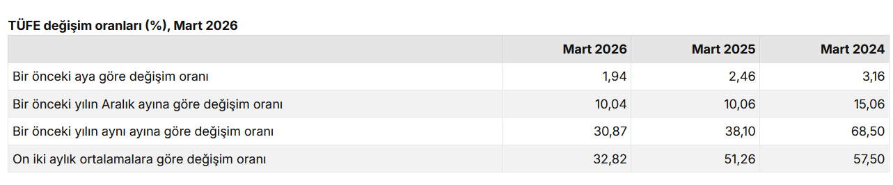 TÜİK’in özel kapsamlı göstergesi (B) ise, işlenmemiş gıda, enerji, alkollü içkiler, tütün ve altın hariç TÜFE’de Mart 2026’da yıllık yüzde 30,11 ve aylık %1,45 artış olduğunu gösterdi.