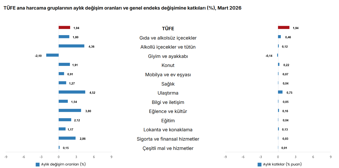 Aylık bazda ise en yüksek artış ulaştırma (%4,52) ve konut, su, elektrik, gaz ve diğer yakıtlar (yüzde 1,91) gruplarında kaydedildi. Gıda ve alkolsüz içeceklerde aylık artış yüzde 1,80 olarak belirlendi.