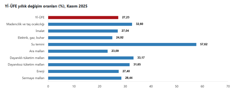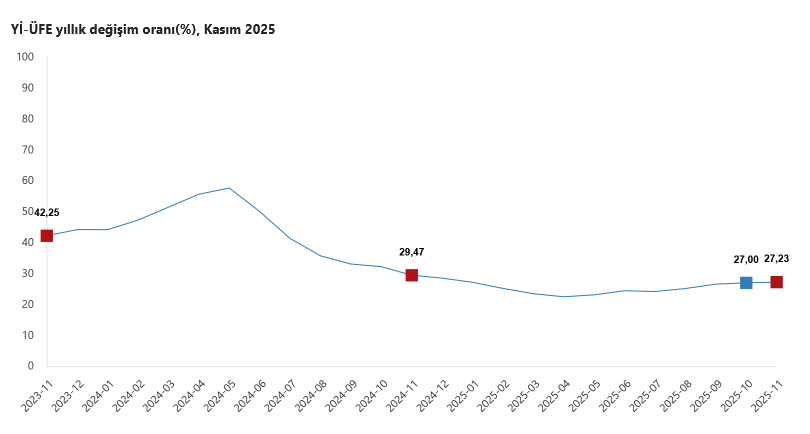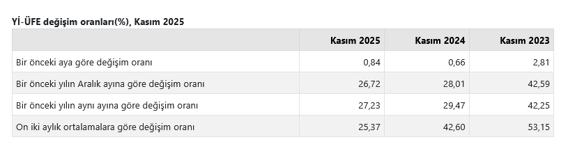 (Ayrıntılarla yenilendi) Türkiye İstatistik Kurumu (TÜİK) verilerine göre, Yİ-ÜFE (2003=100) 2025 yılı Kasım ayında bir önceki aya göre yüzde 0,84 artış, bir önceki yılın Aralık ayına göre yüzde 26,72 artış, bir önceki yılın aynı ayına göre yüzde 27,23 artış ve on iki aylık ortalamalara göre yüzde 25,37 artış gösterdi.