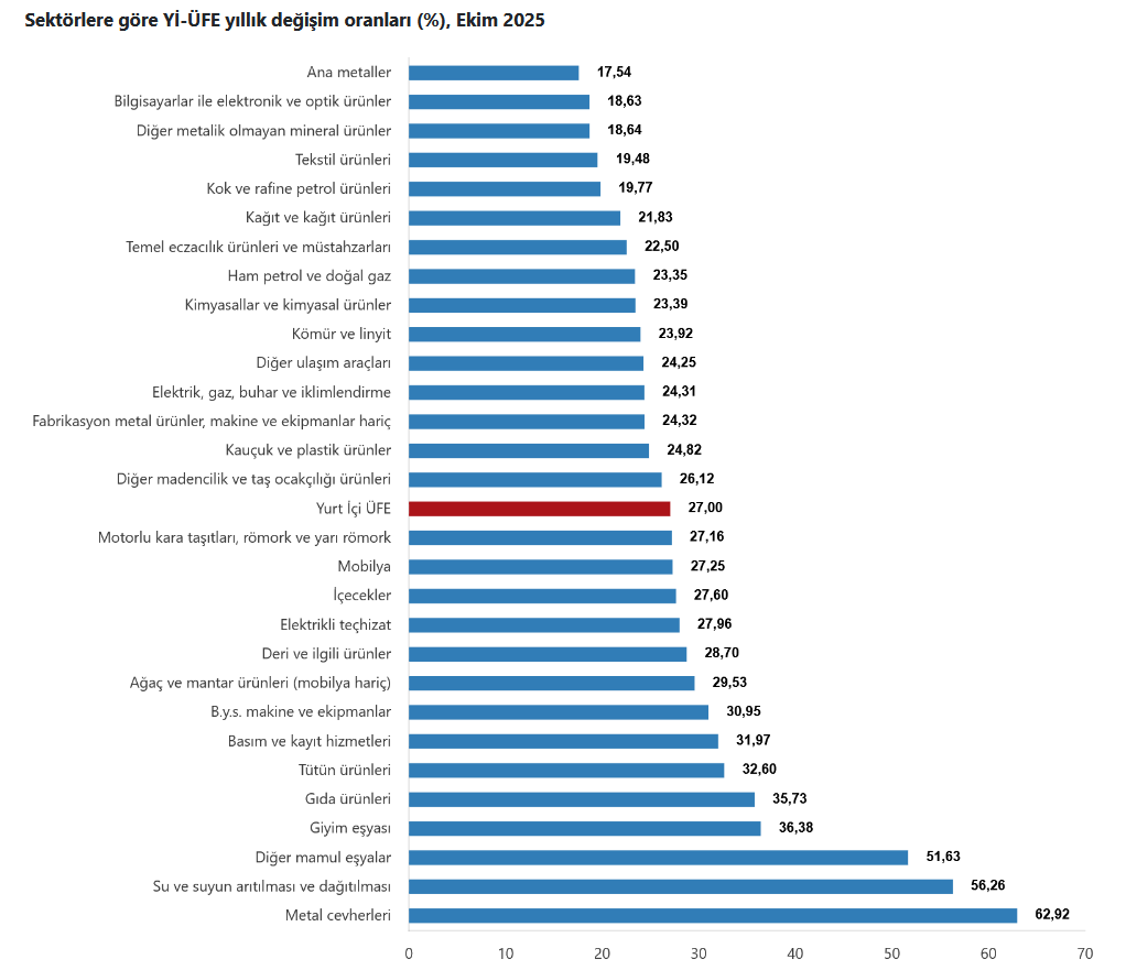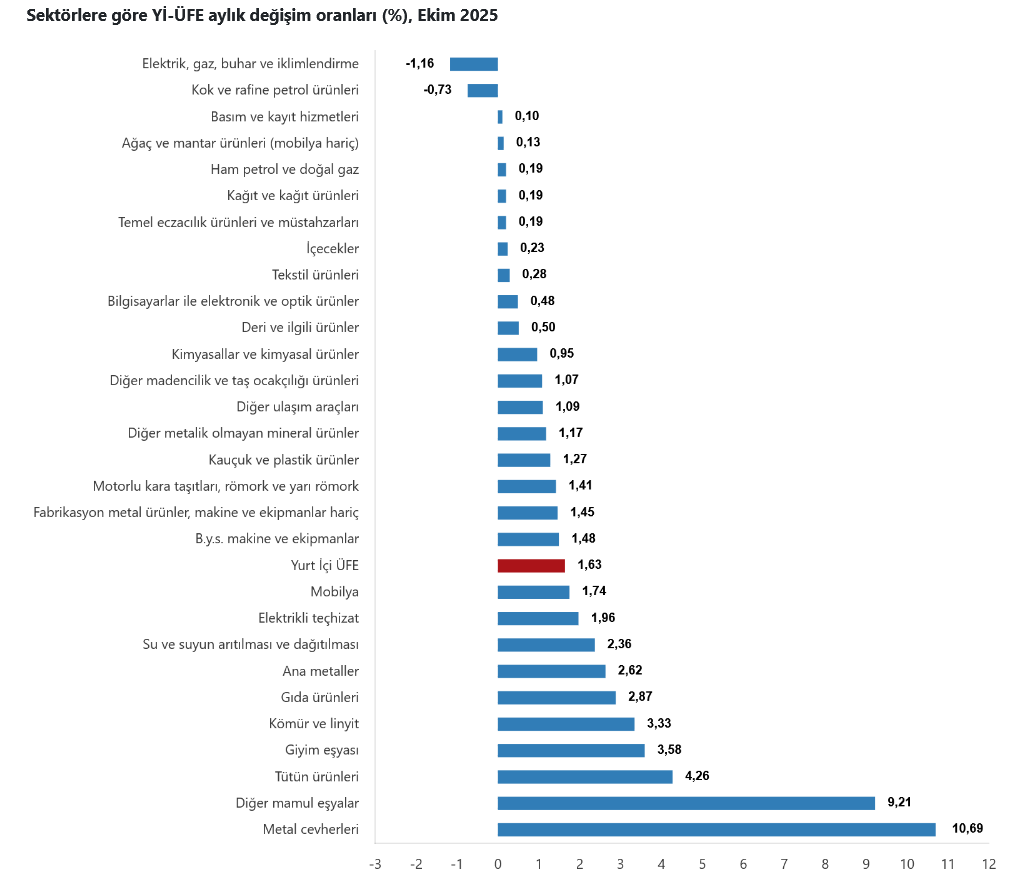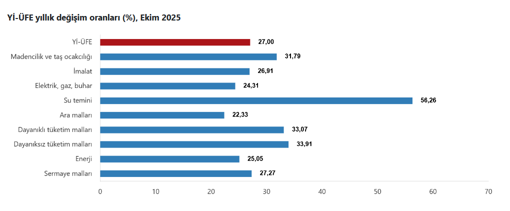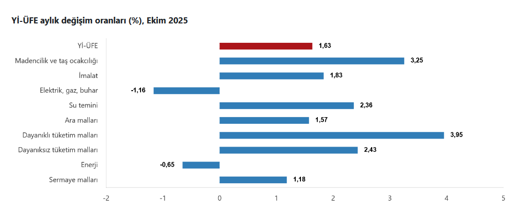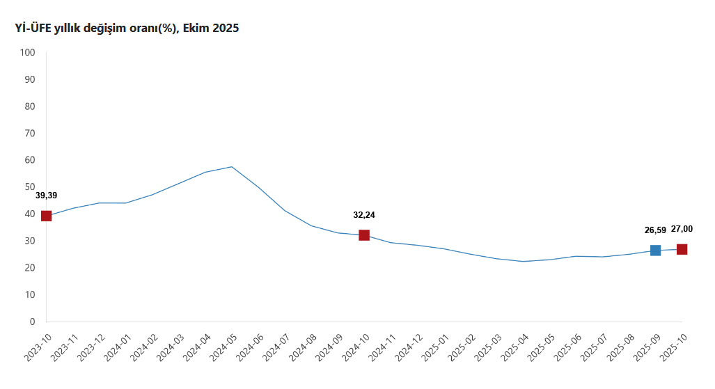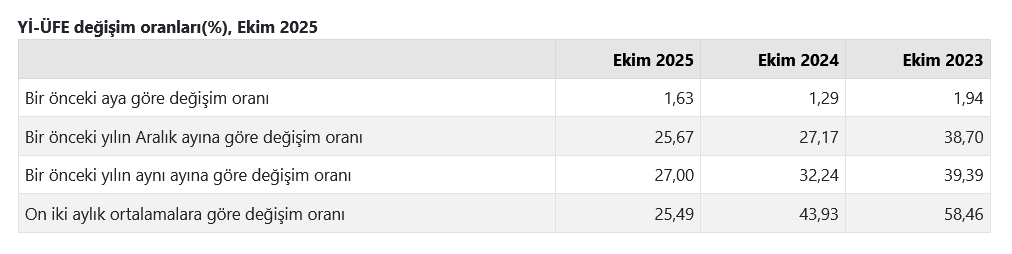 (Ayrıntılarla yenilendi) Türkiye İstatistik Kurumu (TÜİK) verilerine göre, Yİ-ÜFE (2003=100) 2025 yılı Ekim ayında bir önceki aya göre yüzde 1,63 artış, bir önceki yılın Aralık ayına göre yüzde 25,67 artış, bir önceki yılın aynı ayına göre yüzde 27,00 artış ve on iki aylık ortalamalara göre yüzde 25,49 artış gösterdi.