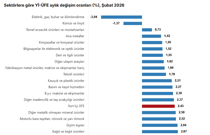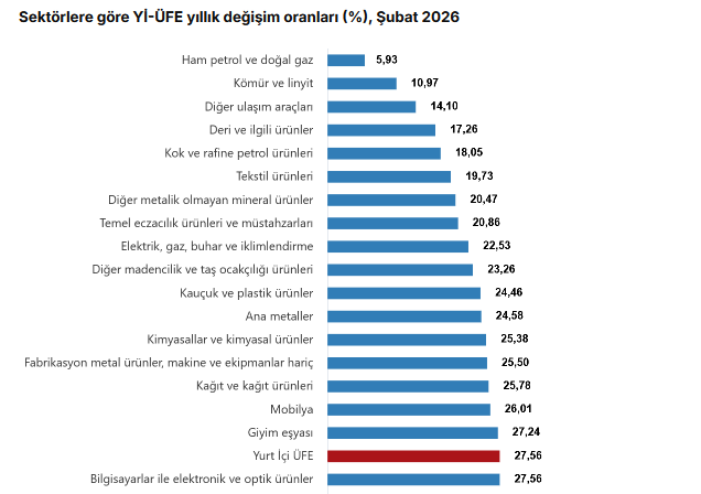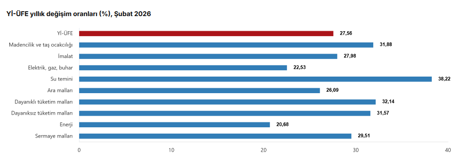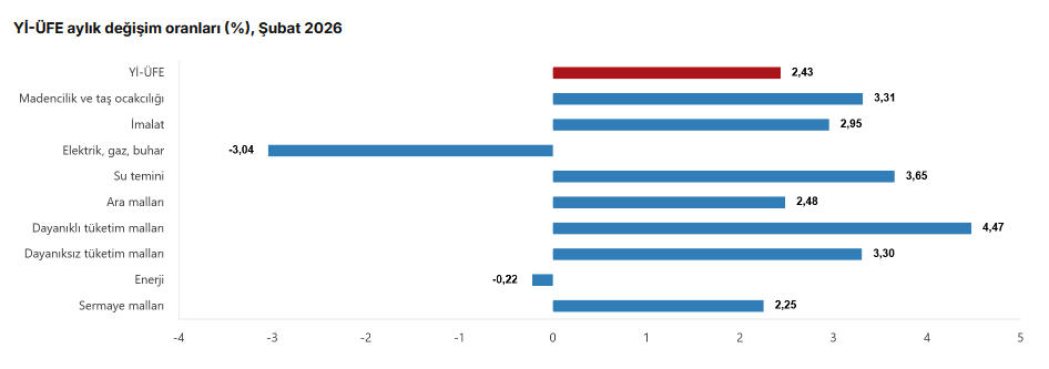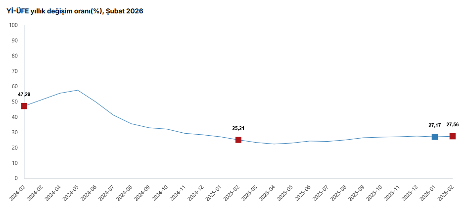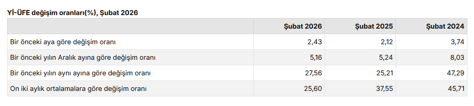 (Ayrıntılarla yenilendi) Türkiye İstatistik Kurumu’nun (TÜİK) verilerine göre, Yİ-ÜFE (2003=100) 2026 yılı Şubat'ta bir önceki aya göre yüzde 2,43 artış, bir önceki yılın Aralık ayına göre yüzde 5,16 artış, bir önceki yılın aynı ayına göre yüzde 27,56 artış ve on iki aylık ortalamalara göre yüzde 25,60 artış gösterdi.