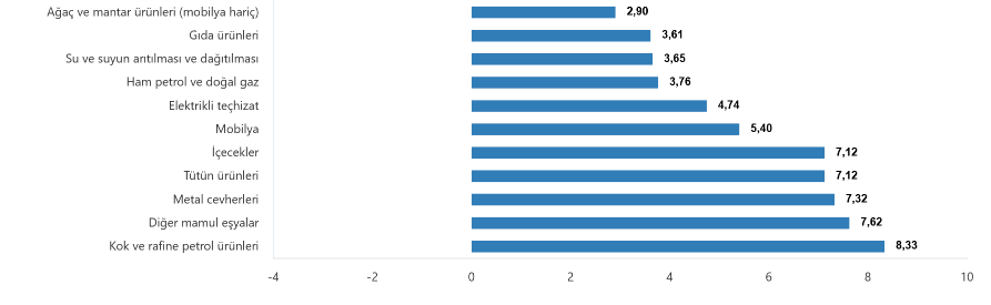 Ana sanayi gruplarının yıllık değişimleri; ara mallarında yüzde 26,09 artış, dayanıklı tüketim mallarında yüzde 32,14 artış, dayanıksız tüketim mallarında yüzde 31,57 artış, enerjide yüzde 20,68 artış ve sermaye mallarında yüzde 29,51 artış olarak gerçekleşti.